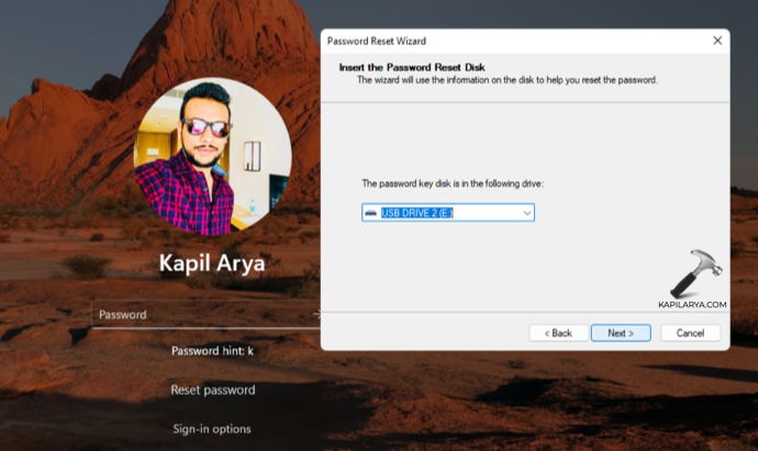 2。パスワードリセットディスクまたはUSBを挿入すると、以前に作成しました。次の画面で、そのパスワードリセットディスクを選択してクリックします次。
