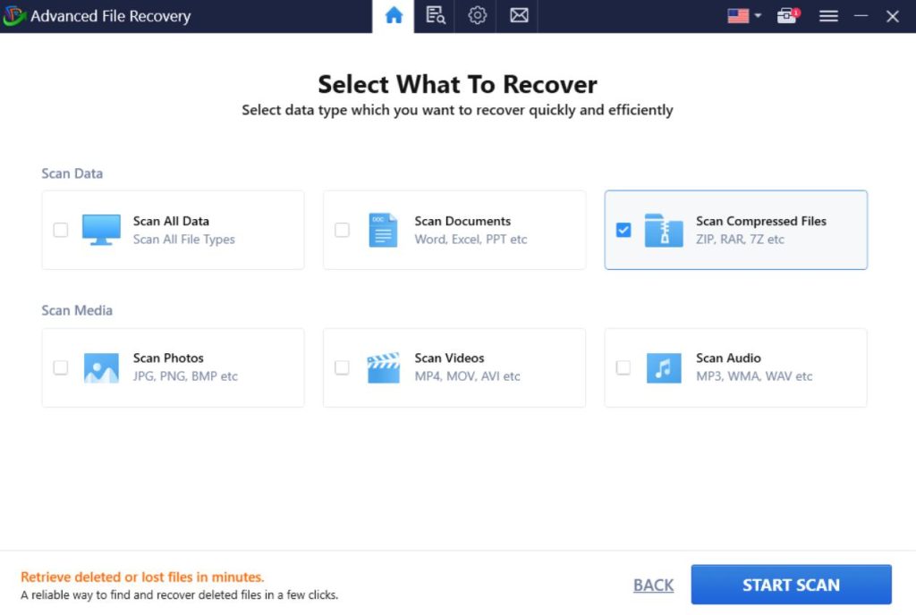 ステップ4 - 次の画面から回復するものを選択します画面、クリックしてください圧縮ファイルをスキャンします。 Advanced File Recoveryは、削除されたZIP、RAR、または7Zファイルまたはこの形式に該当するファイルのみをドライブスキャンします。