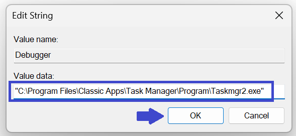 それを作成するには、taskmgr.exe => new =>文字列値を右クリックします。 「デバッガー」と入力し、[OK]をクリックします。