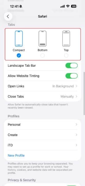 [タブ]セクションには、3つのオプションが表示されます。コンパクト、底、そしてトップ。選択します底下部にアドレスバーがあるiOS 18スタイルを取り戻すには、または選択します。トップそれを上に戻します。