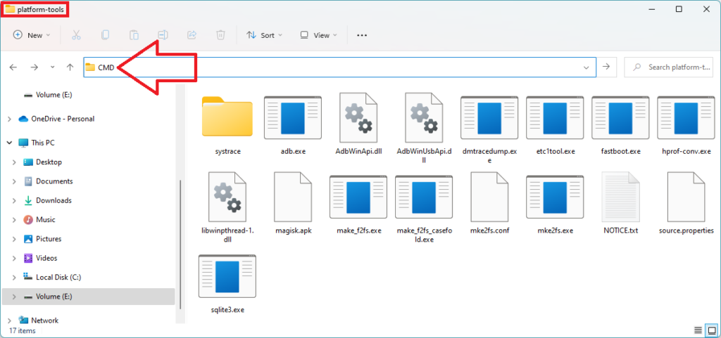 4。次に、抽出したフォルダーに向かいますAndroid SDKプラットフォームツールzipファイル、およびタイプCMD。