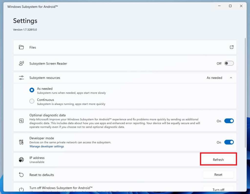 3。をクリックしますリフレッシュしますWSAの更新されたIPアドレスを取得するボタン。