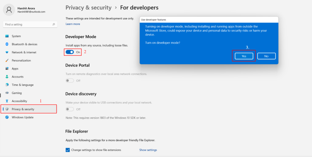 Modded WSAをダウンロードしたら、開発者モードをインストールできるようにする必要があります。以下の手順に従って、Windows 11で開発者モードを有効にします。