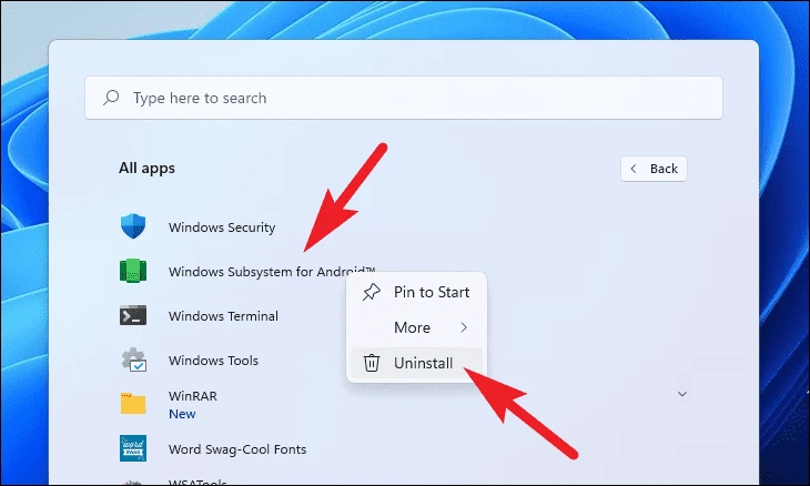 改造されたWSAを手動でインストールする前に、Windows 11 PCにインストールされているWSAの現在のバージョンをアンインストールする必要があります。 WSAの現在のバージョンを削除する手順は次のとおりです。