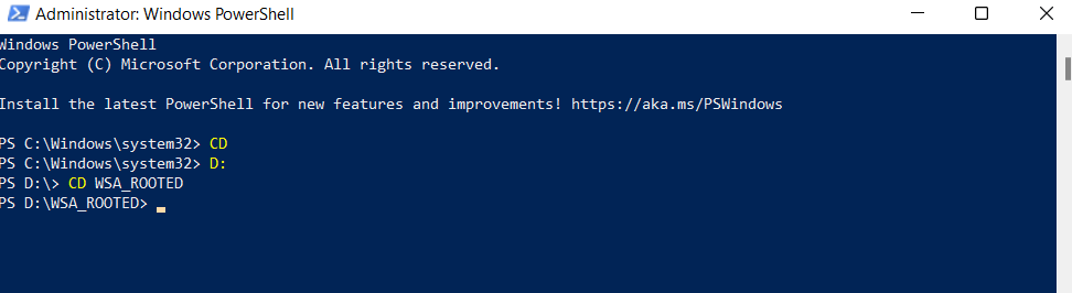 cdD: (Replace ‘D’ with your Drive Name)CD + Folder Name, For instance, CD WSA_ROOTED