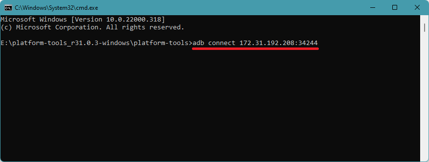 6。次に、上記のコマンドを実行します。ADB Connect(ここのIPアドレス)。たとえば、ADB Connect 202.142.122.36