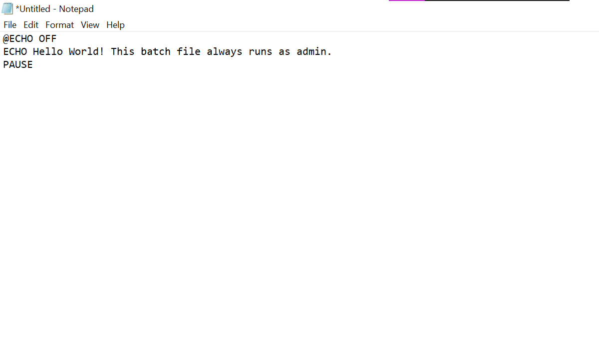 @ECHO OFF ECHO Hello World! This batch file always runs as admin. PAUSE
