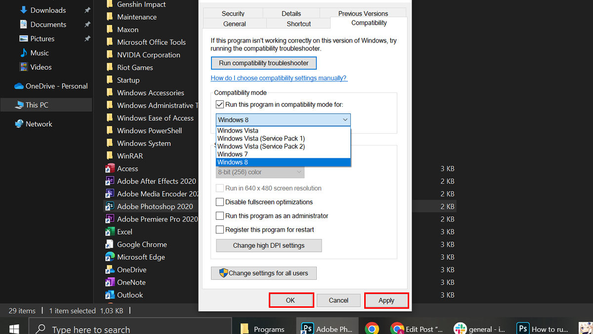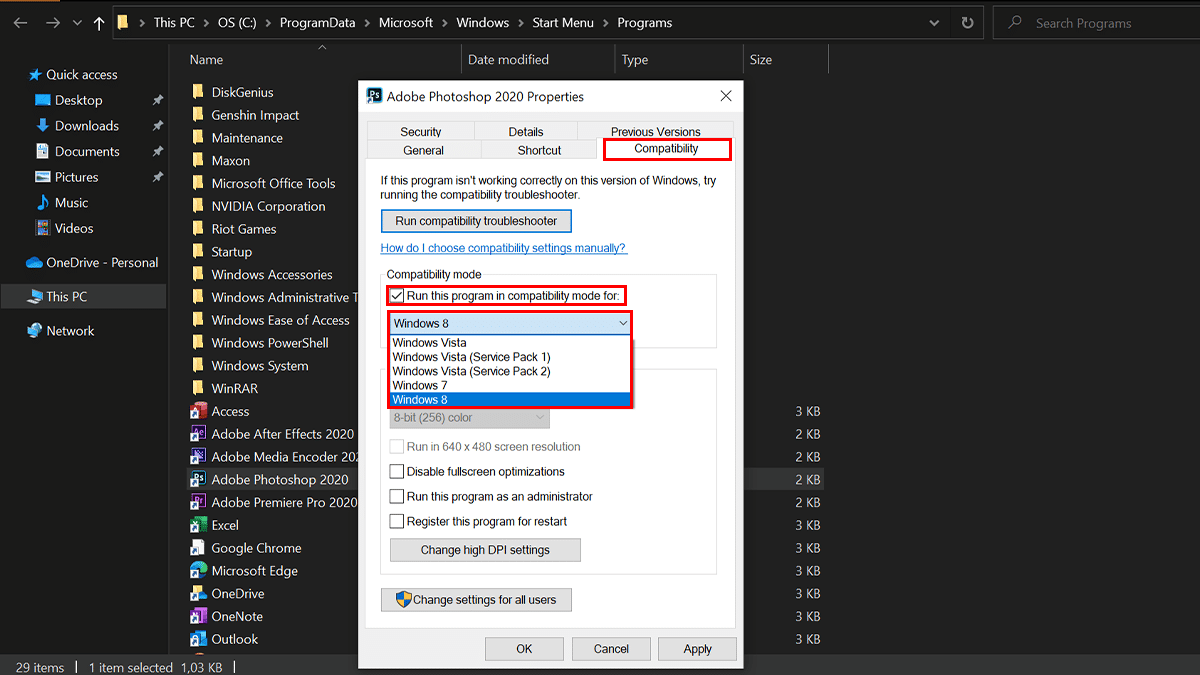 - クリックします互換性タブ>「」を確認しますこのプログラムを互換性モードで実行します」チェックボックス>を選択します互換性モード、 含むWindows95、98、XP、Vista、7、 または8。