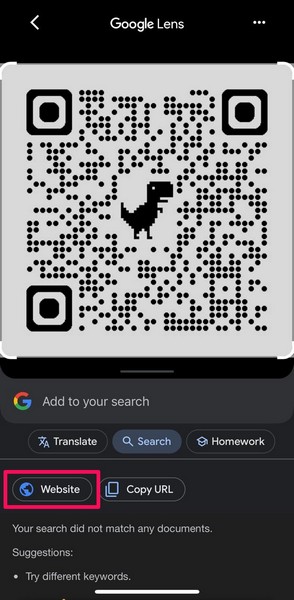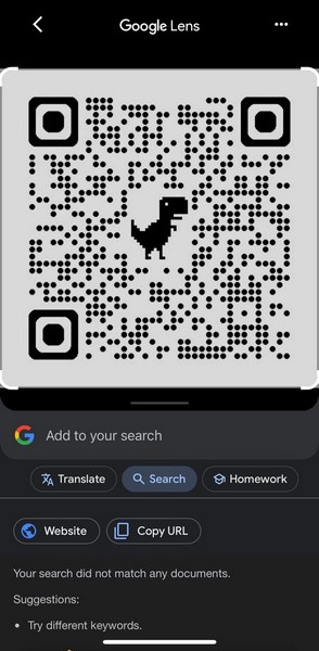 3。GoogleレンズでQRコード画像を開くと、コードを自動的にスキャンしますそれに関連するWebサイトまたはWebページへのリンクを提供するため。
