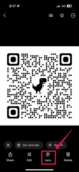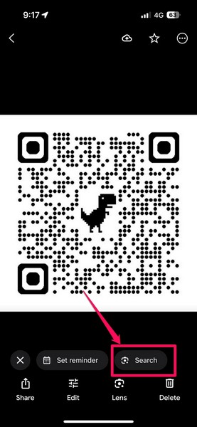 4。または、タップすることもできます検索ボタン同じアクションを実行し、Googleフォトアプリに組み込まれたGoogleレンズツールを使用して画像のQRコードをスキャンします。