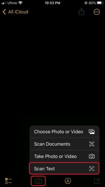 メモを開いて押しますカメラアイコン、次に選択しますテキストをスキャンします。