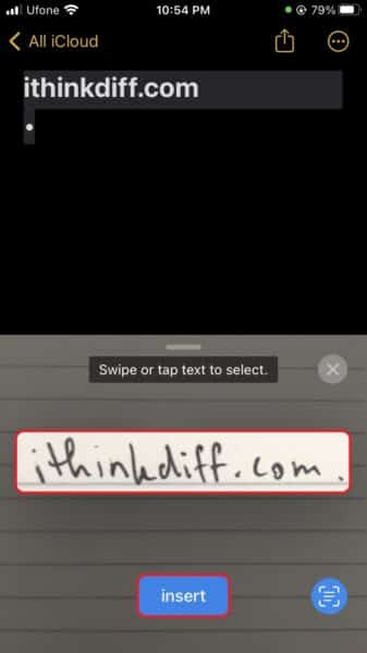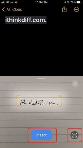 - テキスト全体をそのままスキャンしたい場合は、タップするだけです入れる。ただし、手書きテキストの特定の部分をスキャンする場合は、ライブテキストボタン。