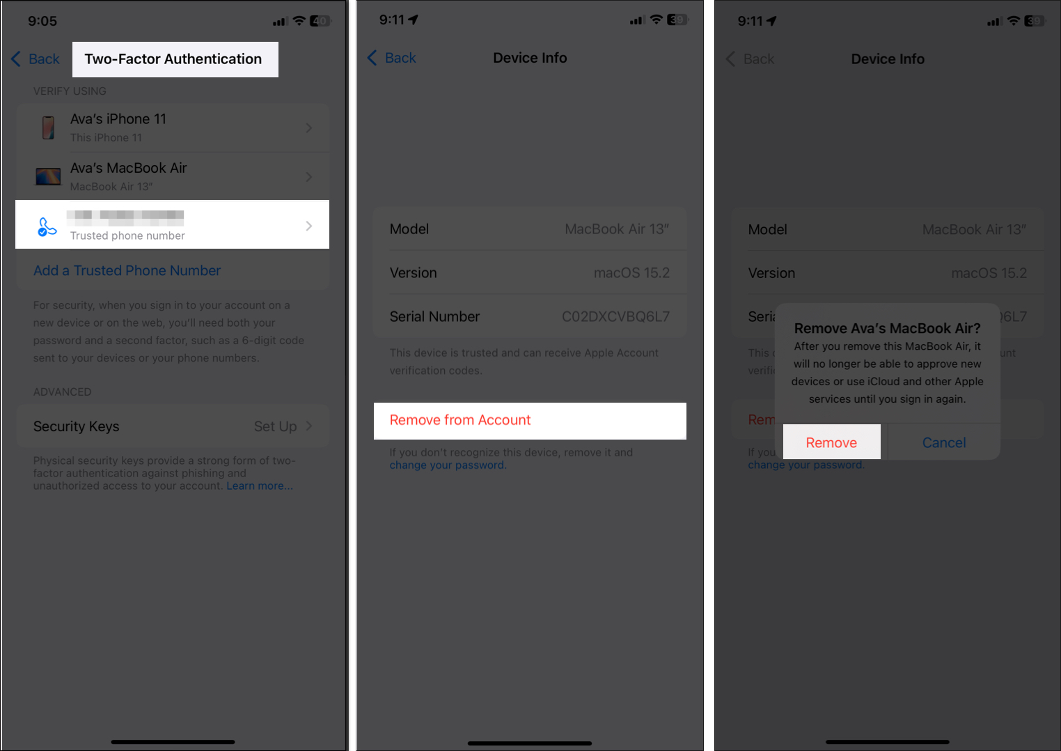 このデバイスで確認プロンプトを受信したくない場合は、アカウントから削除をタップします。次に、Apple IDのパスワードを変更します。これにより、iCloudやその他のAppleサービスからログアウトし、不正アクセスが妨げられます。