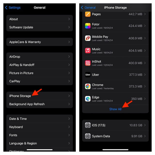 - 設定アプリ - >一般 - > iPhone/iPadストレージ - >利用可能なストレージを確認し、デバイス上の必要な量のストレージスペースを回復するために可能な限りのことを行います。