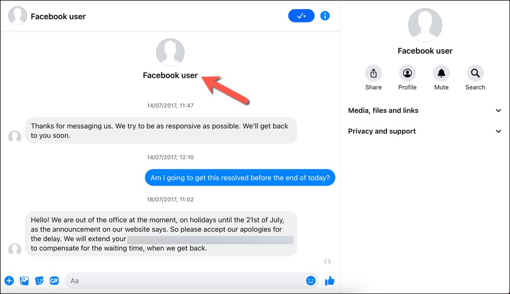 過去にユーザーと直接メッセージを共有した場合、見つける方が簡単です。メッセンジャーでは、会話で共有したメッセージを失うことはありません。それでも、プロフィールや共有されたメッセンジャーの場所など、プロフィールや詳細を表示することはできません。これらの詳細が非表示または欠落している場合、それはあなたがブロックされていることを意味する可能性があります。また、ユーザーに再度メッセージを送信することもできません。