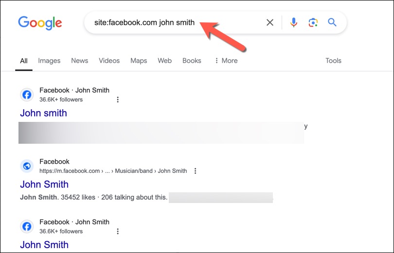 検索エンジンを使用して、それらを見つけるのに役立ちます。他の人よりも公開されているアカウントの場合、Googleでの検索(「Facebook」または「名前サイト:Facebook.com」)の検索は、再びプロファイルを見つけて見えるようにするのに役立ちます。