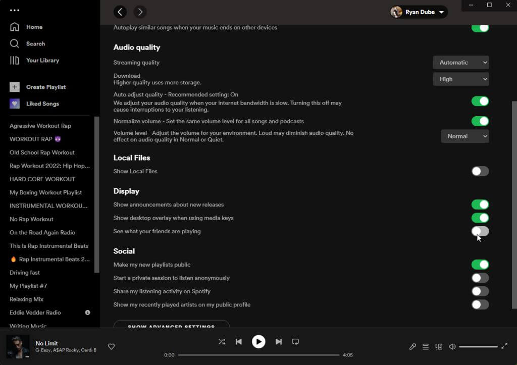 Spotifyデスクトップアプリで、プロファイル画像を選択して選択します設定ドロップダウンメニューから。 [設定]ページで、次のようにスクロールします社交セクション。右側のトグルを無効にしますSpotifyで私のリスニングアクティビティを共有してください。これにより、友達がSpotifyで聞いていることを見る能力が無効になります。