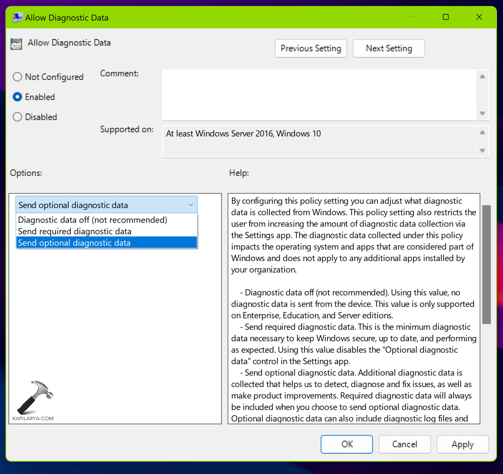 4.オプションから有効にするポリシーを設定して、オプションの診断データの送信を選択します。 [適用]をクリックしてください、OK。