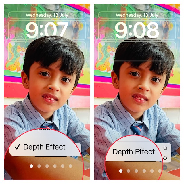 なじみのない人にとっては、深さ効果により、被写体とぼやけた背景に焦点を当てて写真を撮ることができます。 iPhoneでロック画面の壁紙の深さ効果を有効にすると、画像の主題は時間の上に表示されます。そして、それが無効になると、被験者は時間を下回ります。