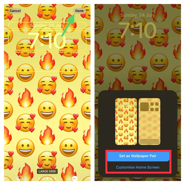 8。カスタマイズに満足したら、タップしてください終わり画面の右上隅で選択します壁紙のペアとして設定しますホームスクリーンとロックスクリーンの両方に壁紙を設定するか、ホーム画面をカスタマイズしますあなたのニーズに応じて別々に。
