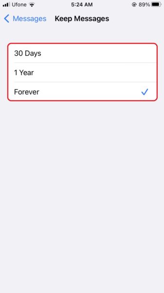 選択したオプションは、送信および受信メッセージに適用されます。この設定はあなたにのみ適用されることに注意してください。メッセージを送信している人が永遠に選択したオプションでは、メッセージはデバイスから削除されません。