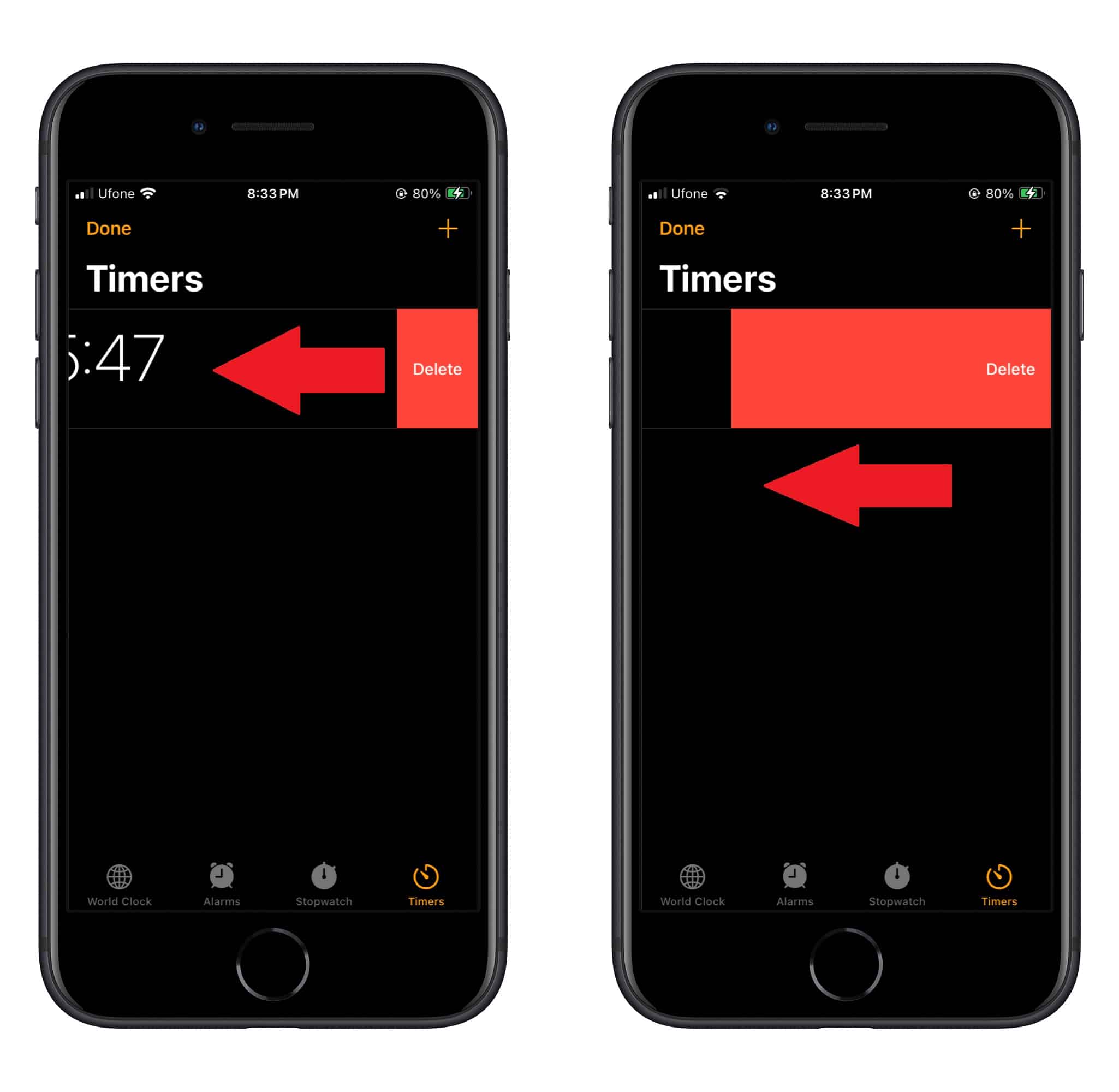 - タイマーの左にスワイプすると、aが表示されます消去右側のアイコン。また、タイマーを左にスワイプして削除することもできます。