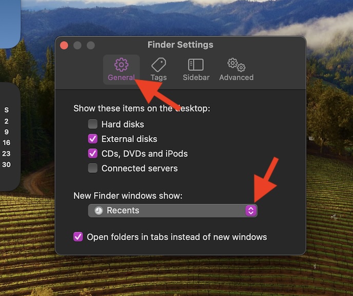 5。次に、複数のオプションを備えた小さなウィンドウが表示されます。に移動します「新しいFinderWindowsShow」セクション。