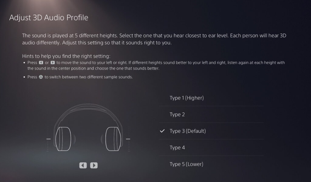 - 選択します3Dオーディオプロファイルを調整します。ヘッドフォンを着用し、画面上の手順に従って、正しいサウンドプロファイルを選択してください。これにより、PS5で3Dオーディオエクスペリエンスが最適化されます。