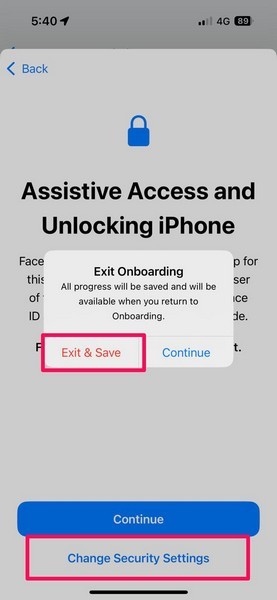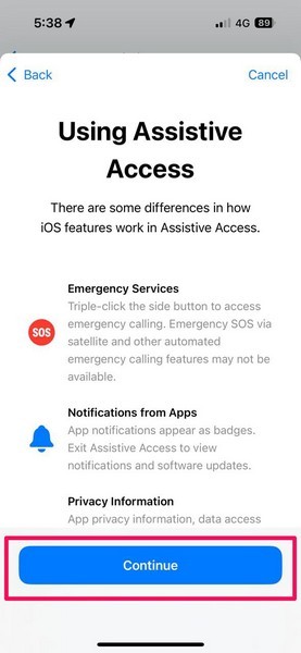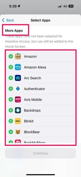 14。アシストアクセスに追加するアプリをカスタマイズしたら、タップします[続行]ボタン最後に追加します。これにより、できますアシスタントアクセスホーム画面に複数のアプリを追加しますiPhoneで機能が有効になっているときにそれらにアクセスします。
