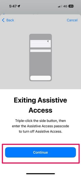 ユーザーは、サイド/パワーボタン(フェイスID対応のiPhoneモデル)またはホームボタン(タッチID対応のiPhoneモデル)をトリプルプレスすることにより、iPhoneのアシストアクセスを終了できます。次のメニューでは、Exit Assistive Accessオプションをタップし、Assistive Access PassCodeを提供すると機能が無効になります。