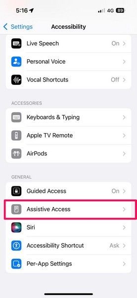 3。下にスクロールして見つけます支援アクセスオプションタップして開きます。