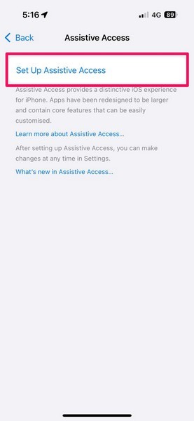 これで、iPhoneでアシストアクセス機能の使用を開始する前に、セットアップする必要があります。セットアッププロセスは少し長いですが、かなり簡単です。また、iOS 18を実行しているiPhone 15でセットアッププロセスを表示していることも注目に値します。ただし、iOS 17以降を実行しているiPhoneモデルで機能を設定できます。