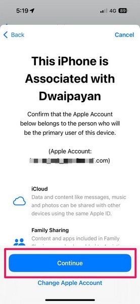 6。次の画面では、デバイスがApple IDの詳細を提供します。タップすることができます[続行]ボタンセットアッププロセスを続行します。