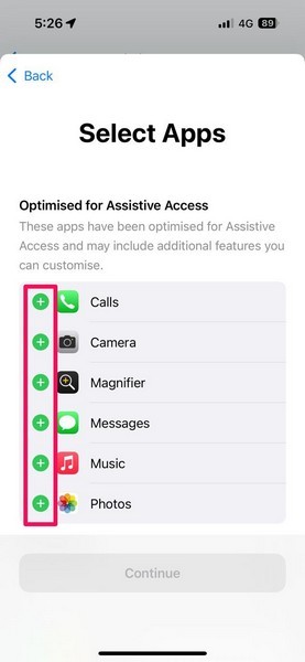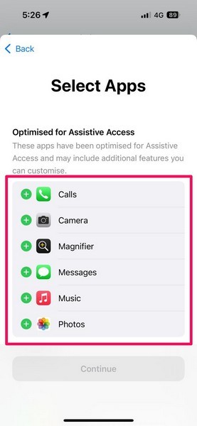 10。さて、次の画面で、あなたはアプリを有効にしますiPhoneで支援アクセスを使用しながらアクセスしたいこと。上部には、すべてのアプリ(主にシステムアプリ)があります支援アクセス用に最適化されています。