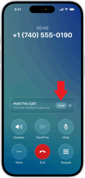 通話を正常に配置します。保留されている場合、iPhoneは短い遅延の後にバナーを表示し、Hold Assistを使用したいかどうかを尋ねます。タップします所有それをアクティブにするか、ラインにとどまる場合はプロンプトを却下します。