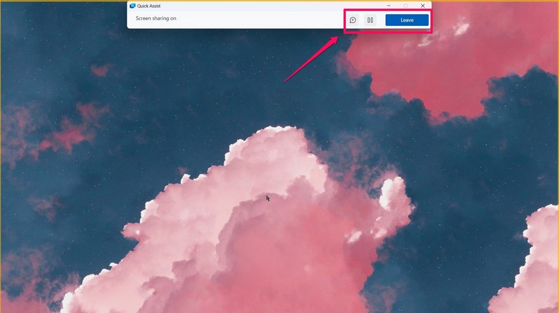 9。一方、レシーバーデバイスが表示されますクイックアシストメニューバー上部には、いくつかのオプションがありますチャット、一時停止、 そして離れるセッション。