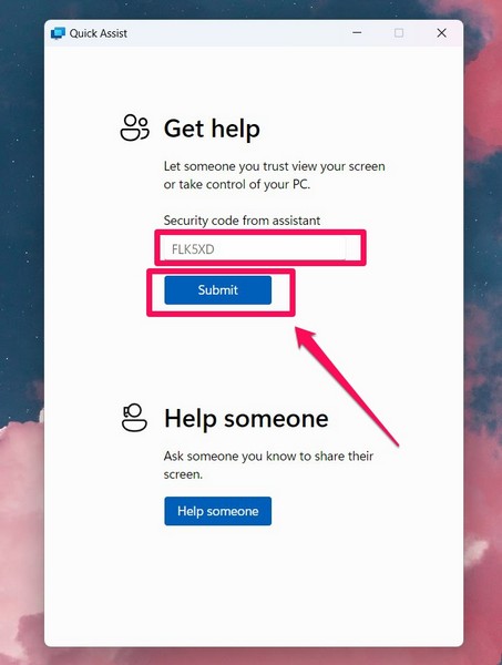 6。受信側のユーザーに尋ねてくださいクイックアシストPCまたはラップトップのアプリと一意のセキュリティコードをテキストフィールドに配置しますの下助けを得るクイックアシストアプリのセクション。これに続いて、受信機はをクリックする必要があります提出するボタン。
