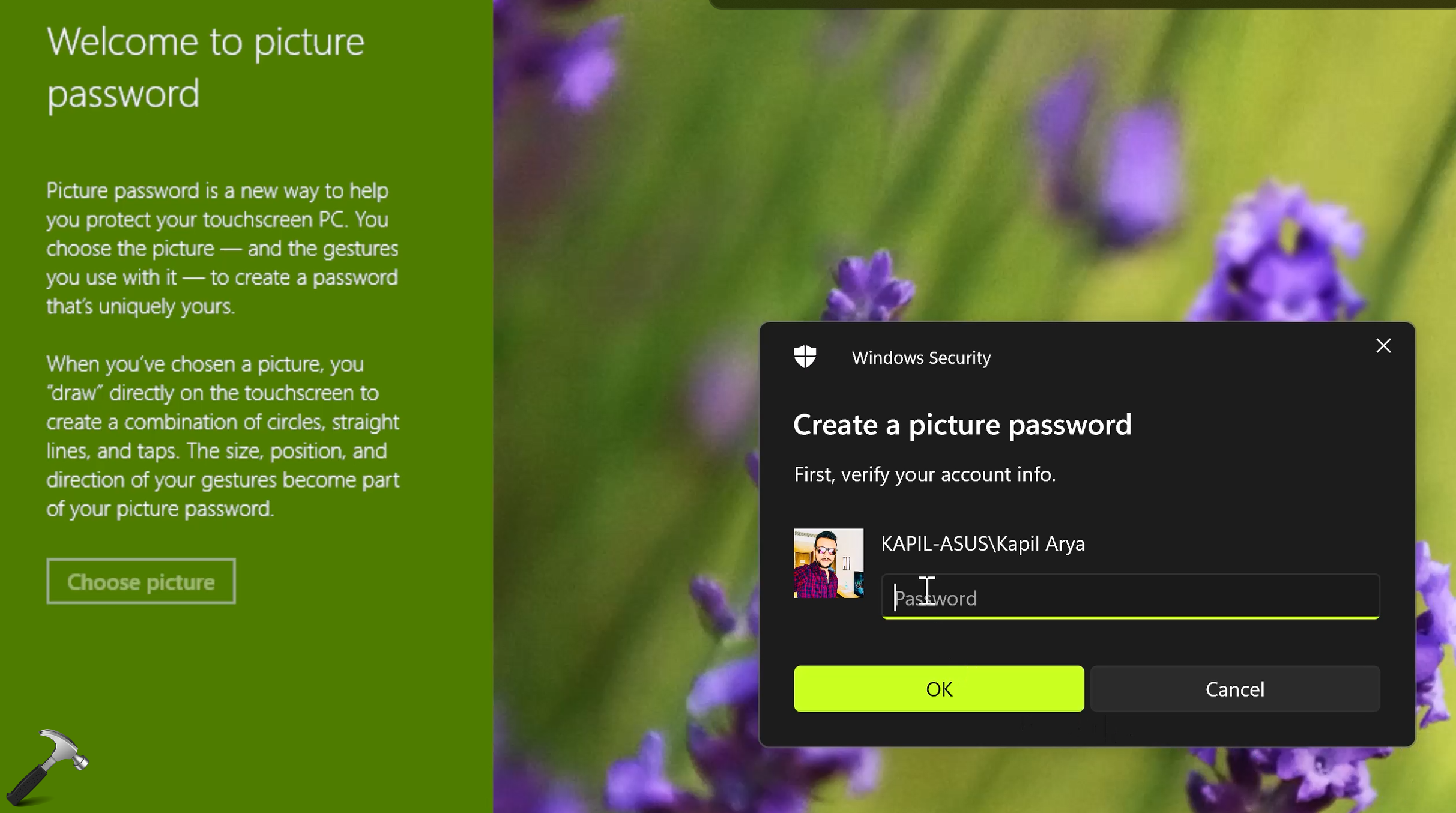 4。これで、写真のパスワードセットアップウィザードに移動します。現在のユーザーアカウントのパスワードを入力して、最初に身元を確認します。