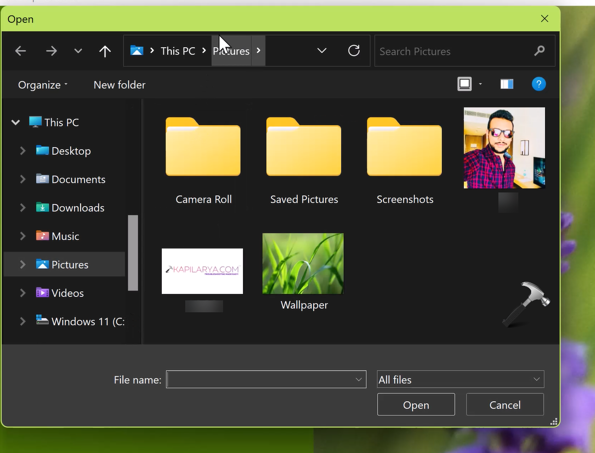 6。これにより、ファイルエクスプローラーブラウザの下に画像ライブラリが開きます。別の場所から写真を使用したい場合は、お気軽に選択してください。