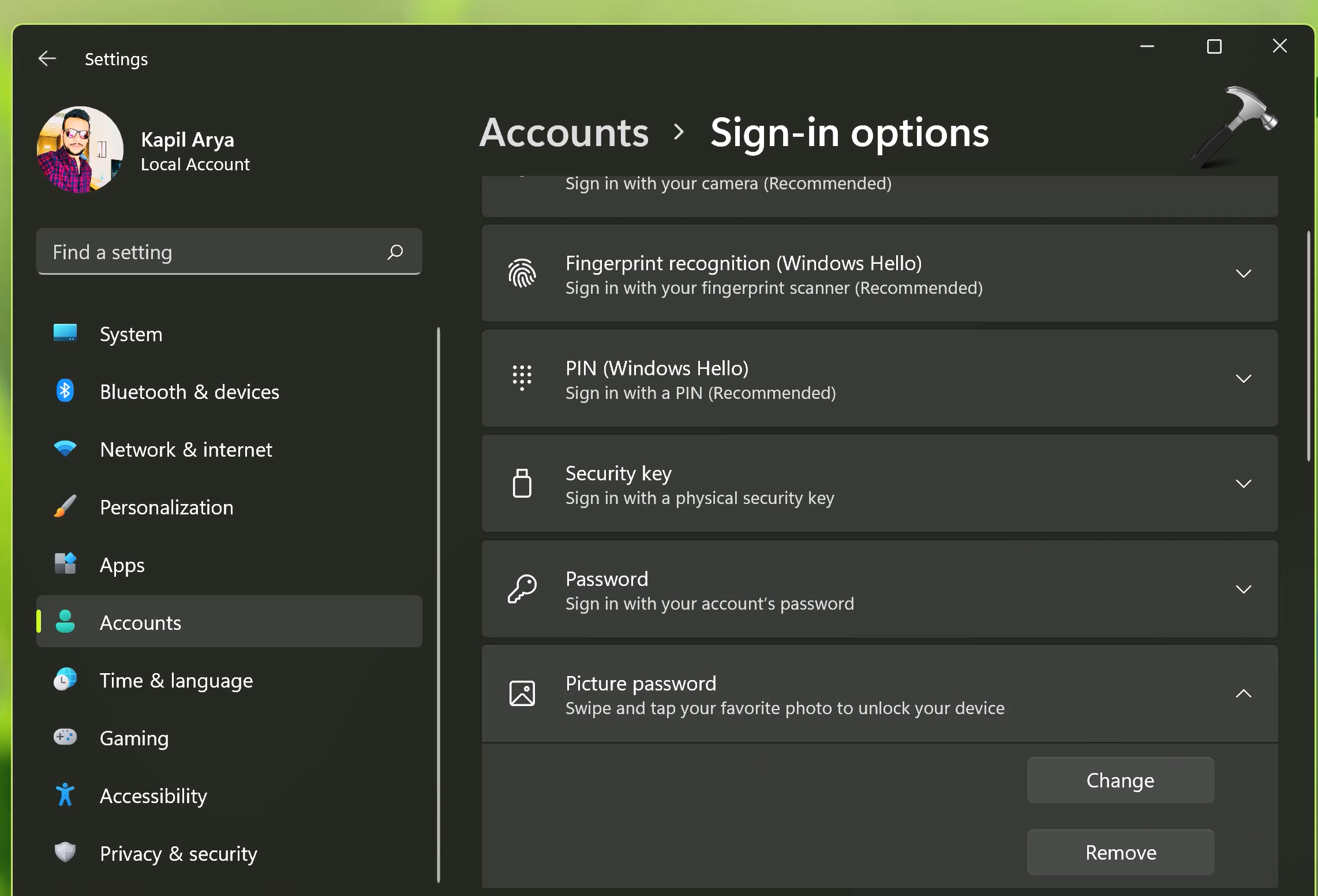 11。画像パスワードは、設定>アカウント>サインインオプションから完全に管理できます。後で画像パスワードを変更または削除する場合は、ここに関連するオプションが存在します。