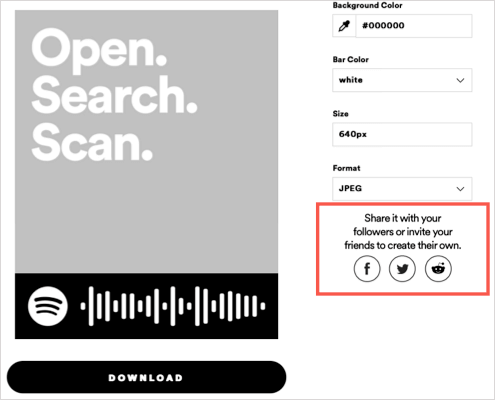 - または、右側のソーシャルメディア共有オプションを選択できます。 Facebook、Twitter、またはRedditにSpotifyコードを投稿してください。