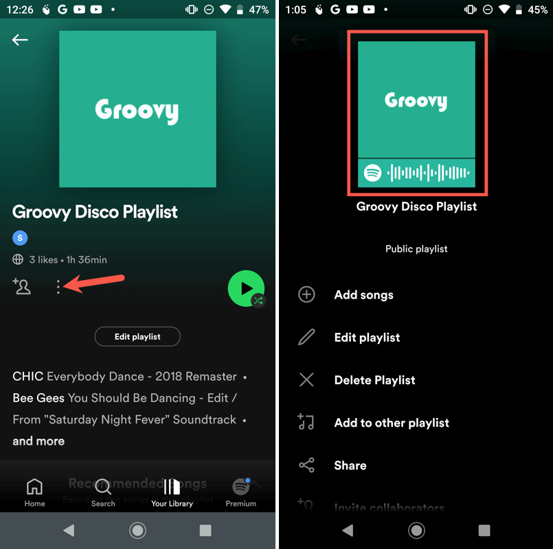 モバイルデバイスでSpotifyを開き、あなたの図書館(Android)または図書館(iPhone)タブ。共有するプレイリストを選択して、次のいずれかを実行します。