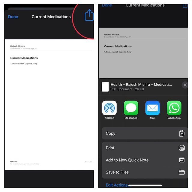 6。これで、標準の共有シートが表示され、メッセージ、WhatsApp、Telegramなどなど、いくつかのアプリを通じて投薬ログを共有できます。また、薬物ログをファイルアプリに保存して、電子メールでエクスポートすることもできます。お客様のニーズに応じて好みの媒体を選択してください。