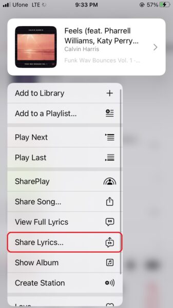 - 次に、曲を長くしてタップします歌詞を共有します。