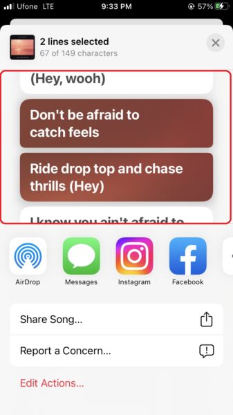 - 共有したい歌詞を選択します。149文字の制限内に収まる限り、複数の行を共有できます。