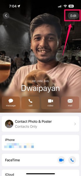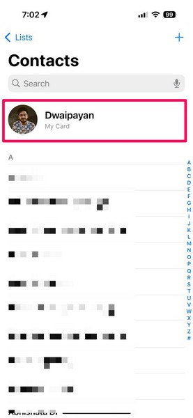 2。連絡先カードをタップしますページの上部に。
