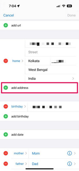 4。少し下にスクロールして見つけますアドレスを追加しますボタンとタップして新しいアドレスを追加します連絡先カードに。