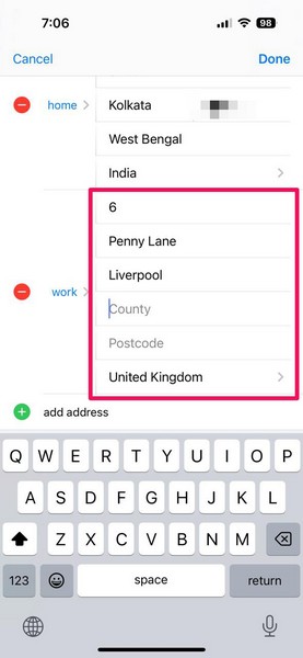 6。自宅の場所の詳細を追加して作業アドレスを追加したら、タップします終わり変更を保存するために右上のボタン。