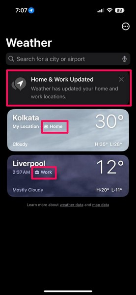 7.連絡先アプリを終了しますあなたのiPhoneでWeatherアプリを起動します。あなたが見つけるでしょう新しい通知、アプリが家と職場の場所を更新したことに言及しています。さらに、あなたはそうします天気カードで家と仕事のラベルを見つけるそれぞれの場所の。