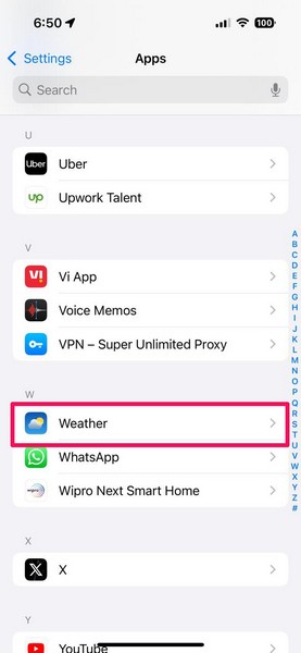 3。を見つけます天気次のリストのオプションとタップして開きます。